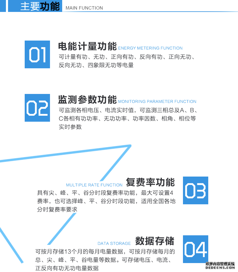 - 主要功能:有功,功率因素,有功功率,無功功能,四象限無功,電壓,電流,事件報警,需量